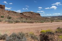 A scenic view of Blue Notch Road in Utah. The road winds through the desert, surrounded by red rock formations and towering mountains. The landscape is dominated by sand and dirt, with a clear blue sky overhead. An off-road track for nature enthusiasts in Canyonlands.