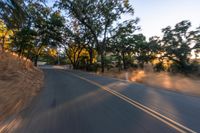 A beautiful image showing a blurred shot of some trees and a road in the background. The image depicts a scene during the day with a blurry image of an orange motorcycle. The road is made of asphalt and surrounded by grass and vegetation. In the distance, there are mountain landforms and a clear blue sky with sunlight shining through the clouds. This rural landscape evokes a sense of tranquility and natural beauty.
