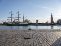 a small boat sitting on top of a brick ground near a river with ships in the background