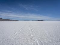 A serene landscape in Utah, USA, with the Bonneville Speedway in the distance. The open desert plain leads straight down the road, surrounded by mountains. The calm blue lake on the horizon reflects the clear sky.