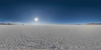 A fish-eye view of the sky over Bonneville Speedway in Utah. The clear sky and icy desert landscape create a stunning backdrop. The two-lane salt surface track leads to Salt Lake City, with mountains in the distance.