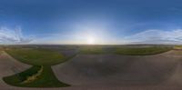 Open field in Brandenburg, Germany, bathed in early morning sunshine. Agricultural landscape with clear skies and visible contrails. Rolling hills and lush greenery in the valley create a picturesque dawn scene.