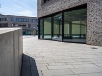 This is an image of a modern office building in Bremen, Germany. The architecture is characterized by clean lines and rectangular shapes. The building has large windows and smooth grey surfaces. The clear sky above contrasts with the hard shadows cast by the building and the surrounding urban environment. The foreground shows a brick road surface and wooden flooring. This photo represents the urban design and business district of Bremen in Europe. It captures the vibrant city life and the modern architecture that defines the city's skyline.
