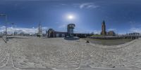 Bremen's cityscape showcases a blend of modern and traditional architecture. Cobblestone streets lead to a clock tower, overlooking a bustling waterfront. Clear skies reflect on the calm waters of the harbor, creating a serene atmosphere in this European city.