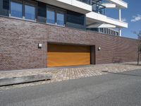 an exterior view of a building with a brick driveway and large sliding door for a garage