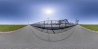 Bremen's urban design is captured in this fisheye view of the city's container port. The industrial landscape is dominated by cranes and factory buildings, while the clear sky highlights the city's modern infrastructure.