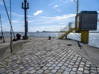 A straight road in Bremen, Germany, lined with charming cobblestone architecture. The road leads to a picturesque harbor with a jetty and pier, surrounded by water and clear skies. The perfect spot for leisure and relaxation in Europe.