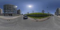 A busy street in Bremen, Germany, with cars driving down a straight road lined with modern architecture and high-rise buildings. The clear sky contrasts with the urban landscape. A typical day in the vibrant city of Bremen.