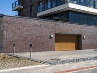 This stock photo features a modern residential building with an interesting architecture design located in Bremen, Germany. The building has a combination of brickwork and wood elements, with rectangular windows and doors. The grey brick walls create a stylish and urban look. The clear sky and natural daylight enhance the beauty of the property. The image also showcases a clean asphalt road and a well-designed driveway. The city life and urban design of Bremen, a city in Europe, are well represented in this photo. The image is ideal for illustrating urban living, city architecture, and property concepts.