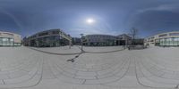 A 360-degree view of modern architecture in Bremen, Germany. Three buildings with different angles and distinct materials create a symmetrical urban design. Sidewalks and open spaces invite city life. Clear sky adds to the vibrant atmosphere.