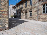 This is an image of a classic brick wall in Berlin, Germany. The architecture reflects the city's rich history and urban design. In the foreground, there is an alley-way leading to a courtyard surrounded by warehouse buildings. The clear sky adds a touch of brightness to the scene. This photo represents the vibrant city life of Berlin, with its mix of classic and modern architecture. The brick wall and surface textures add to the city's charm. It is a perfect representation of the cultural and architectural beauty of Europe.