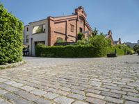 This stock photo showcases a large brick driveway that runs alongside a building in Berlin, Germany. The driveway leads to a parking lot lined with hedges, adding a touch of green to the urban landscape. The photo captures the combination of classic architecture and contemporary city life in Europe. The clear sky and neatly paved road surface enhance the overall appeal of this residential area.