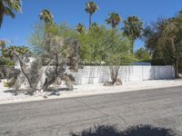 This image showcases a modern residential home in Palm Springs, California. The house features a stunning combination of modern architecture and mid-century design elements. The lush green surroundings and clear sky provide a beautiful backdrop for this suburban villa. The white brick walls and tile walls add an elegant touch to the overall aesthetic. The palm trees and bushes in the foreground reflect the unique landscape of the Sonora Desert. This photo captures the essence of California living with its contemporary style, beautiful outdoors, and tranquil ambiance.