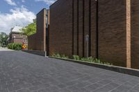 A modern residential area in Toronto, Canada. Brick walls line the streets, complementing the vibrant urban design. Cloudy skies contrast with the clean lines of the buildings and asphalt roads. Explore the city life in this bustling metropolis.