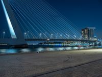 This is a night view of a bridge and city skyline in Holland, Netherlands. The image captures the modern architecture and urban design of the city. The azure lights reflect off the water and highlight the high-rise buildings in the background. The bridge itself is illuminated by street lights, creating a beautiful contrast against the dark sky. The clear sky and open space contribute to the overall cityscape. This photo represents the vibrant city life and artificial light that can be experienced when visiting Holland.