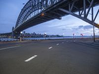 An empty lot with a bridge spanning over the road. Urban skyline and skyscrapers create an artificial light display against the dawn sky. Coastal cityscape features water and underpass.