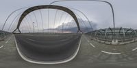 two fisheye images of a bridge with a cloudy sky in the background and traffic lights