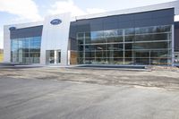 the exterior of a ford dealership with its doors open and trees reflected in windows