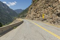 This is a photo of a road in Lillooet, British Columbia, Canada. The straight and low road cuts through the highland landscape, surrounded by mountains and vegetation. The road surface is made of asphalt and is guarded by a rock wall and Armco barrier. The clear sky above contrasts with the terrain and slope of the area. This photo captures the beauty of nature and the scenic drive in British Columbia.