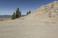 A rugged mountain terrain in British Columbia, Canada. The off-road track cuts through the rocky landscape, with gravel and dirt roads winding through the slope. Clear skies above showcase the breathtaking Okanagan Valley.