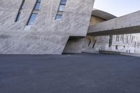 A modern architecture museum in Tenerife, Spain. The concrete facade and composite material walls create a striking profile against the clear day sky. The Brutalist architecture exhibits a unique blend of rock and surface lines.