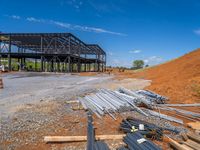 A sunny day at a construction job site in the USA. A clear sky contrasts with the steel office building and equipment on the dirt and gravel surface. Open space and architecture showcase the construction industry in action.