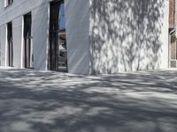 a man riding a skateboard past a building that has windows and a white fence