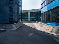 This image captures the vibrant city life of a modern business district in Holland, Netherlands. The photo showcases a straight road lined with sleek office buildings and modern architecture. The black and blue building in the center stands out against the urban landscape. A skateboarder can be seen going around the building, adding a touch of dynamic movement to the scene. The photo represents the energy and liveliness of city life in Europe. Explore the bustling streets of this vibrant city and experience the blend of culture and architecture.