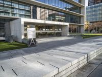 This image showcases a modern urban design in Lisbon, Portugal. The photo captures a large stone bench near a building in the city. The bench is surrounded by concrete block steps and a sidewalk. The vibrant city life can be seen in the background, with modern architecture and office buildings. This public space is a perfect representation of the urban landscape and architecture in Lisbon. The photo reflects a typical day in the busy business district of the city.