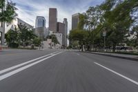 A view of a busy Los Angeles highway from above. The asphalt road stretches straight ahead, surrounded by skyscrapers and cityscape. The cloud and motion blur hint at the city's fast-paced urban life.