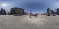 A busy intersection in Toronto, Ontario, with modern architecture and a clear sky. The elevated road and residential buildings create a vibrant cityscape. Cars and trees line the streets, while pedestrians cross the crosswalks. A snapshot of urban life in Canada.