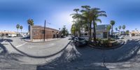 a fish eye view of a busy street with palm trees and a building in the background