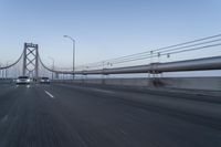A stunning view of a cable-stayed bridge at dawn. The clear sky and break of day create a beautiful backdrop. The motion-blurred traffic on the highway adds a dynamic element to the image.