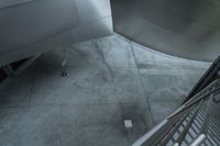A top-down view of the Walt Disney Concert Hall in Los Angeles, California. The modern architectural design features a white composite material exterior with elevated stairs and open spaces. A futuristic urban design that blends seamlessly with the city's vibrant life.