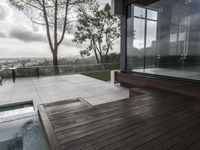 a view of a large deck with a hot tub and glass wall overlooking trees and water