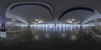 a full view of a parking garage from inside a fish eye lens, the cars are parked in and out the large space