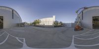 A wide-angle view of a modern office building in Los Angeles, California. The clear sky contrasts with the low concrete structures in the parking lot. Straight roads lead to the business district, while a crane stands tall in the foreground.
