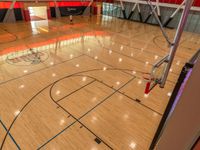 a gym floor with wood look and blue lines on the floor and inside, an air filled basketball court is shown