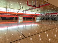 This is an image of a brightly colored basketball court located inside an indoor gym building in California, USA. The wooden floors and net create a vibrant and energetic atmosphere. The photo showcases a day at the stadium, where sports enthusiasts gather to play and watch basketball. The court represents the passion and dedication of athletes in California, known for its love of sports. With its bright colors and wooden floors, this image captures the excitement of the game and the vibrant spirit of the stadium.