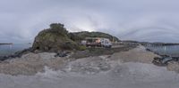 a panorama of a beach next to the sea and a mountaintop with a pier