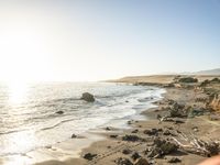 This captivating image captures the beauty of the California coast at dawn. The coastal landscape features a sandy beach, crashing waves, and rocky formations. The open space and high elevation provide stunning views of the ocean, sea, and horizon. The clear sky and sunshine illuminate the surface of the water, creating a picturesque scene. In the distance, the sun is visible, adding warmth and radiance to the natural environment. This photo represents the serene and sunny atmosphere of a California beach at the break of day.