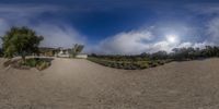 A modern architecture house in Los Angeles, California, with a stunning view of the beach and grass field. The clear sky contrasts with the clouds, creating a serene and peaceful atmosphere. The perfect residential area for nature lovers.