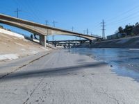 A suburban road in Los Angeles, California, leads to a concrete bridge over the river. Clear sky illuminates the open space underneath the overpass. Residential walls and electrical wires line the road.