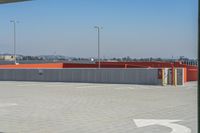 A view of the urban landscape of Los Angeles, California. The city's iconic architecture and bustling city life are reflected in the concrete and asphalt surfaces. The clear sky overlooks the city's parking decks and garages, while boats line the nearby shipping containers.