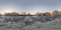 A virtual tour of Los Angeles showcases its modern architecture and vibrant cityscape. The dawn reveals a parking lot filled with automobiles. The buildings feature sleek facades and large windows, while trees and vegetation add a touch of nature to the urban landscape.