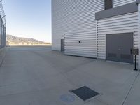 A modern architecture building in Los Angeles, California. The concrete street leads to the entry, while metal walls and a loading dock indicate an urban warehouse. Clear sky illuminates this city's dawn.