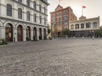 This is an image of a classic architecture hotel and restaurant located in the downtown area of Los Angeles, California, USA. The photo was taken at dawn, showing the clear sky above. The open space plaza is paved with cobble stone, adding to the urban charm. The surface of the plaza reflects the early morning light, creating a warm and inviting atmosphere. This image represents the vibrant city life of Los Angeles, where people can enjoy dining out and exploring the city's architectural beauty.