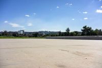 An empty street in Los Angeles, California, with a skateboard resting on the concrete surface. Cityscape in the distance contrasts with the clear sky. Open space invites skateboarding during the day.