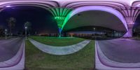 A cityscape view of a metropolis at night in California. The purple glow of a large green light post adds an artistic touch. The straight road leads to a mixed-use neighborhood with high-rise buildings and a concrete bridge. A glimpse into the vibrant city life.