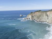 a beautiful cliff and some waves in the water on a clear day from above a hill